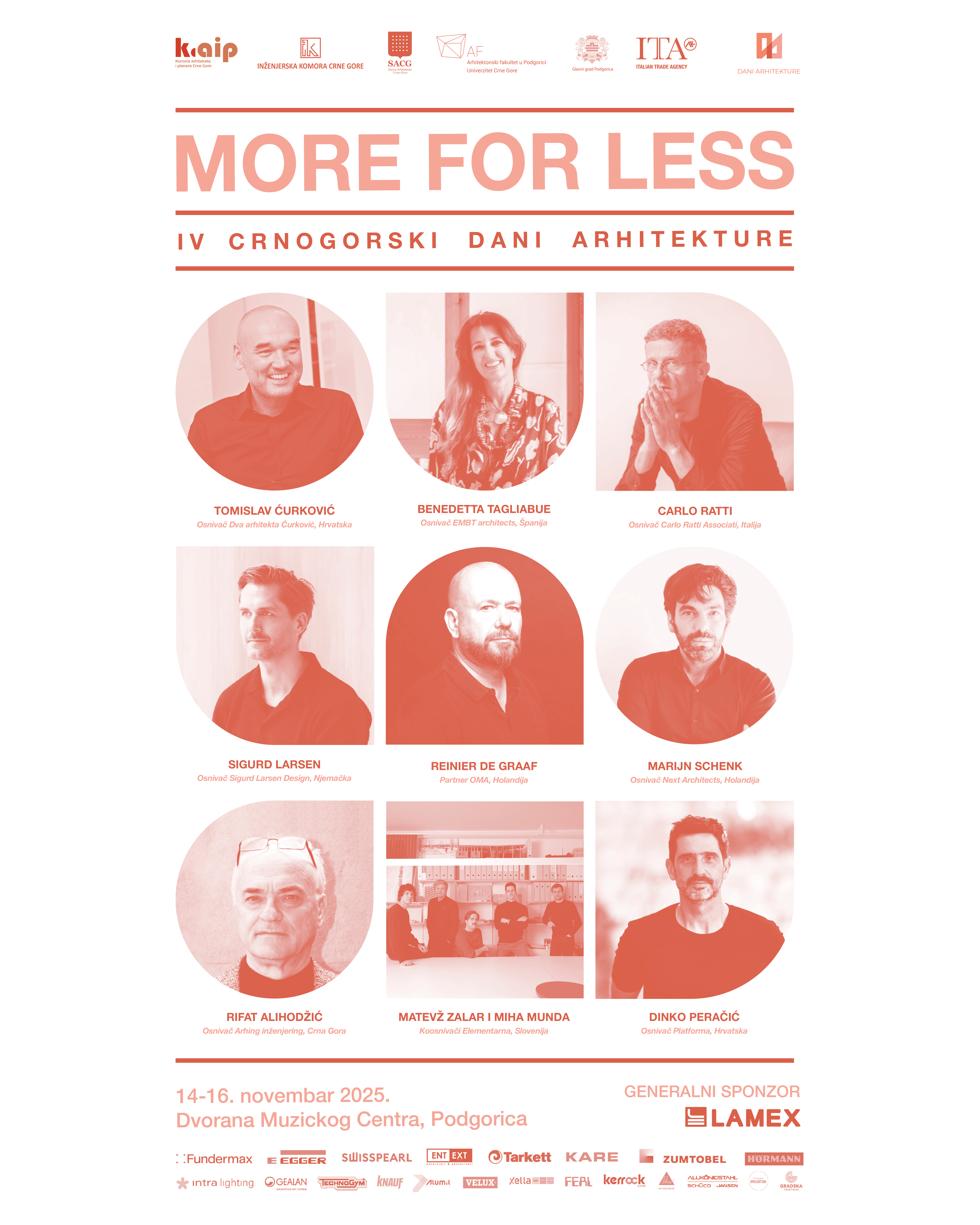 Komora arhitekata i planera Crne Gore i Inženjerska Komora Crne Gore u razdoblju od 14. do 16. studenoga 2025. godine u Muzičkom centru Crne Gore u Podgorici organiziraju četvrte Dane arhitekture u Crnoj Gori sa službenom temom: MORE FOR LESS.