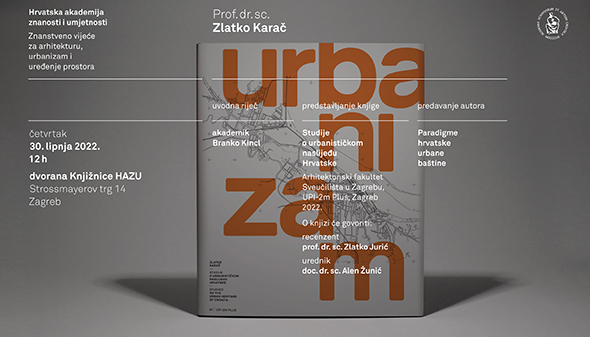 U okviru programa Znanstvenog vijeća za arhitekturu, urbanizam i uređenje prostora Hrvatske akademije znanosti i umjetnosti, održat će se predstavljanje knjige „Studije o urbanističkom naslijeđu Hrvatske“ prof. dr. sc. Zlatka Karača, s popratnim autorovim predavanjem „Paradigme hrvatske urbane baštine“. Uz uvodno obraćanje predsjednika Znanstvenog vijeća, akademika Branka Kincla, o knjizi će govoriti recenzent prof. dr. sc. Zlatko Jurić i urednik doc. dr. sc. Alen Žunić. Knjiga je sufinancira u okviru programa HKA.